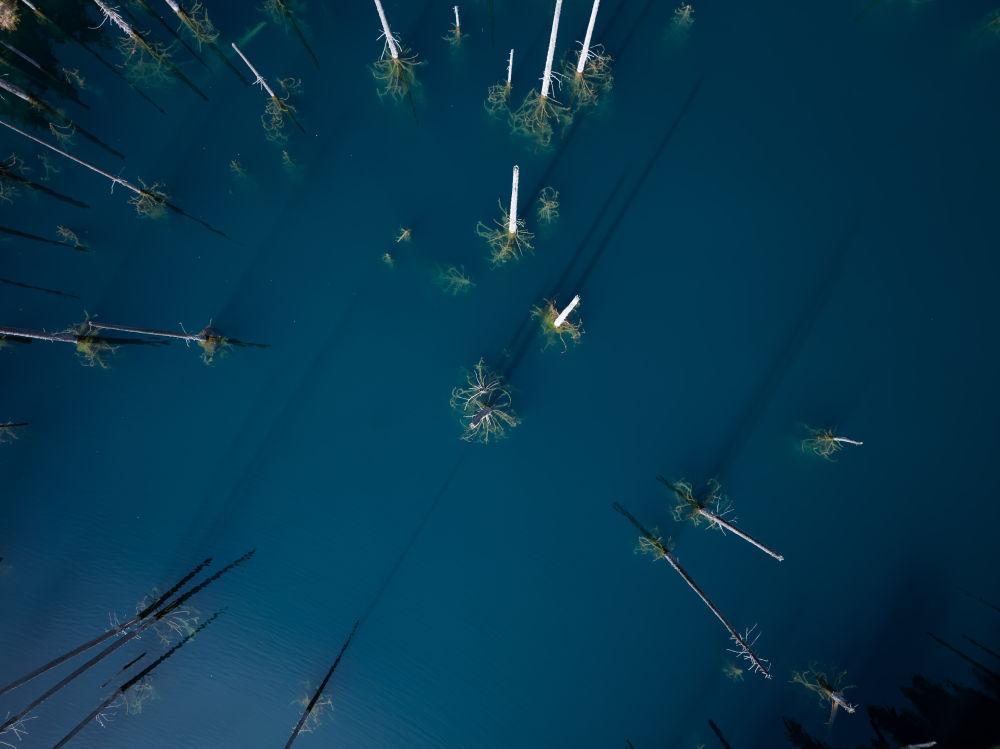 這是10月21日在哈薩克斯坦阿拉木圖州拍攝的卡因德湖倒立森林(無人機照片)。